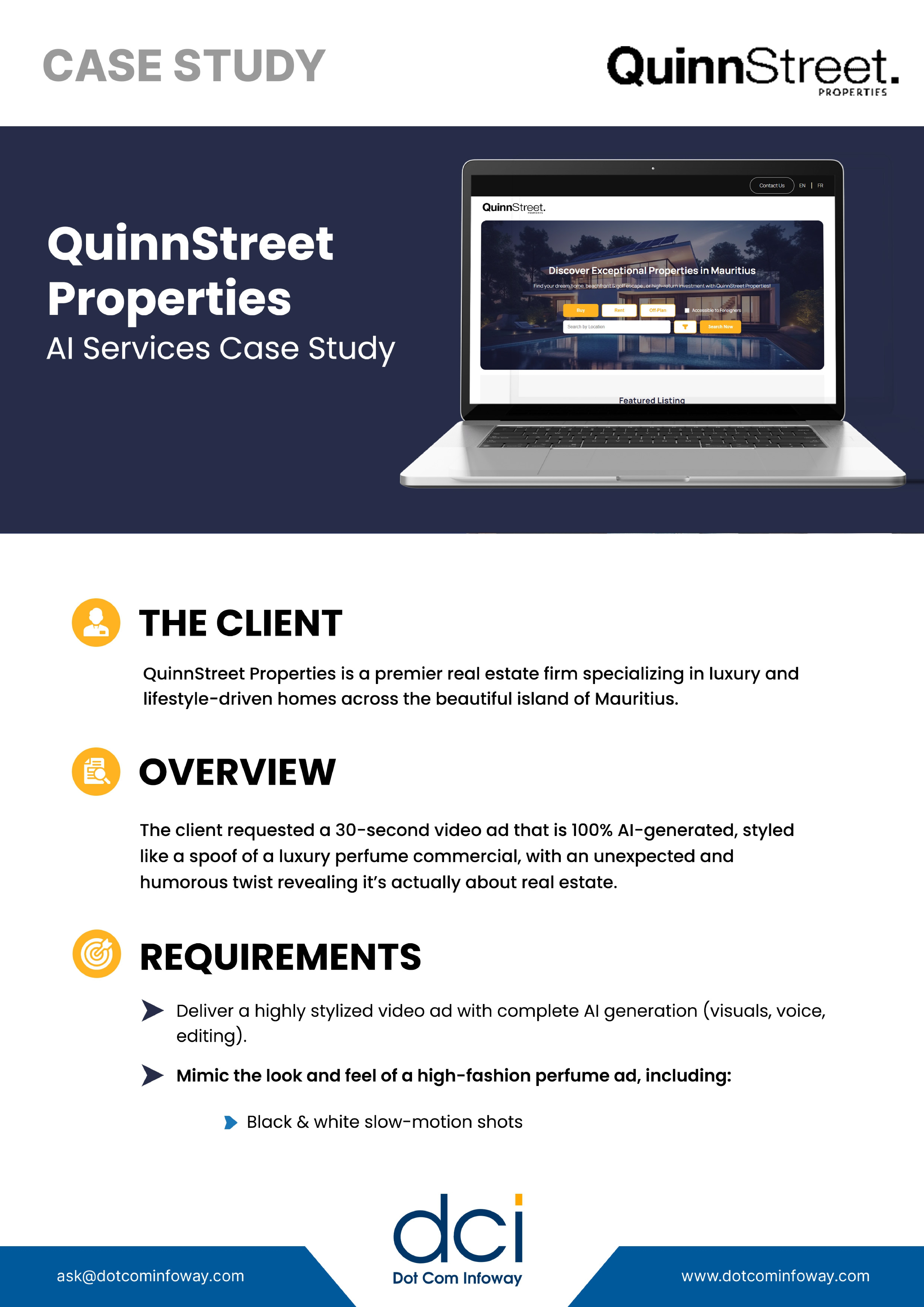 The client requested a 30-second video ad that is 100% AI-generated, styled like a spoof of a luxury perfume commercial, with an unexpected and humorous twist revealing it’s actually about real estate.